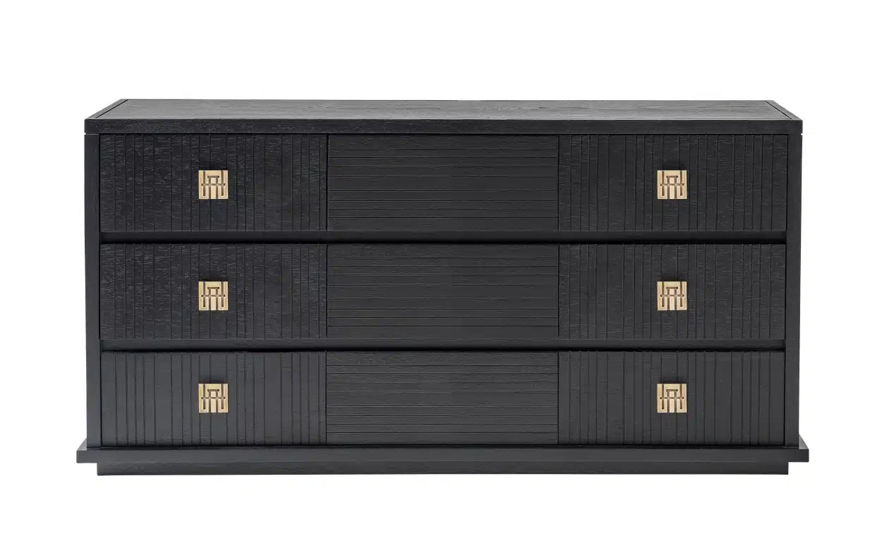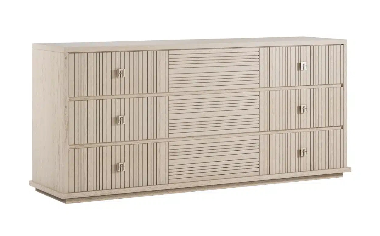 Dieses Stück verfügt über neun Schubladen, von denen jede ein geroutetes Detail mit einer Anordnung von sich kreuzenden Linien aufweist, einige vertikal und andere horizontal, um einen angenehmen visuellen Eindruck zu erzeugen. Die beiden oberen Schubladen sind mit Metallbeschlägen versehen. Dies ist ein Beispiel für ein einzigartiges Möbelstück von Adriana Hoyos, handgefertigt mit hochwertigen Materialien und einem zeitlosen Design.