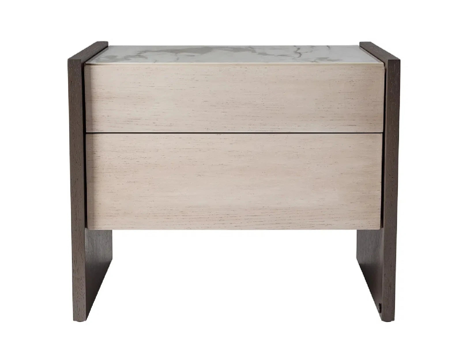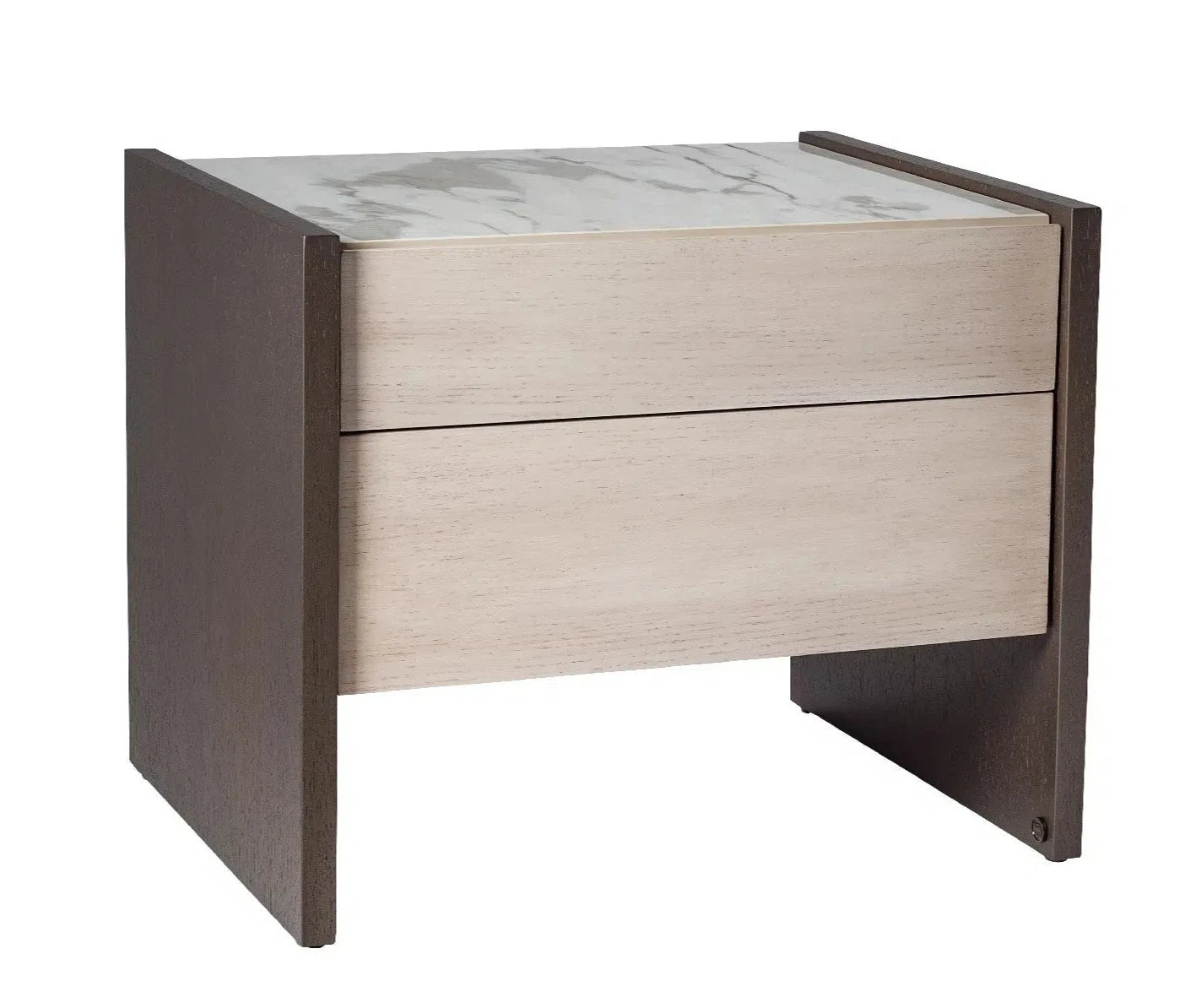 Ein Nachttisch von beeindruckenden Proportionen, der in verschiedenen Holzausführungen angepasst werden kann. Dieses einzigartige Stück verfügt über eine Steinoberfläche, die ihm eine zeitlose Note verleiht. Die obere Schublade ist kleiner als die untere Schublade. Dieses Möbelstück eignet sich ideal für kleinere Räume, und sein minimalistischer Stil kann problemlos zu anderen Betten und Möbelstücken passen.