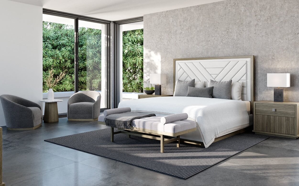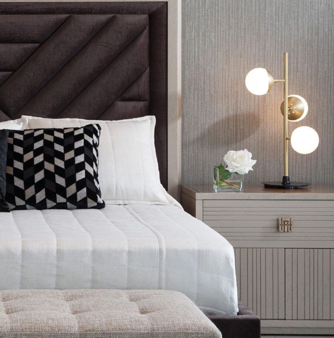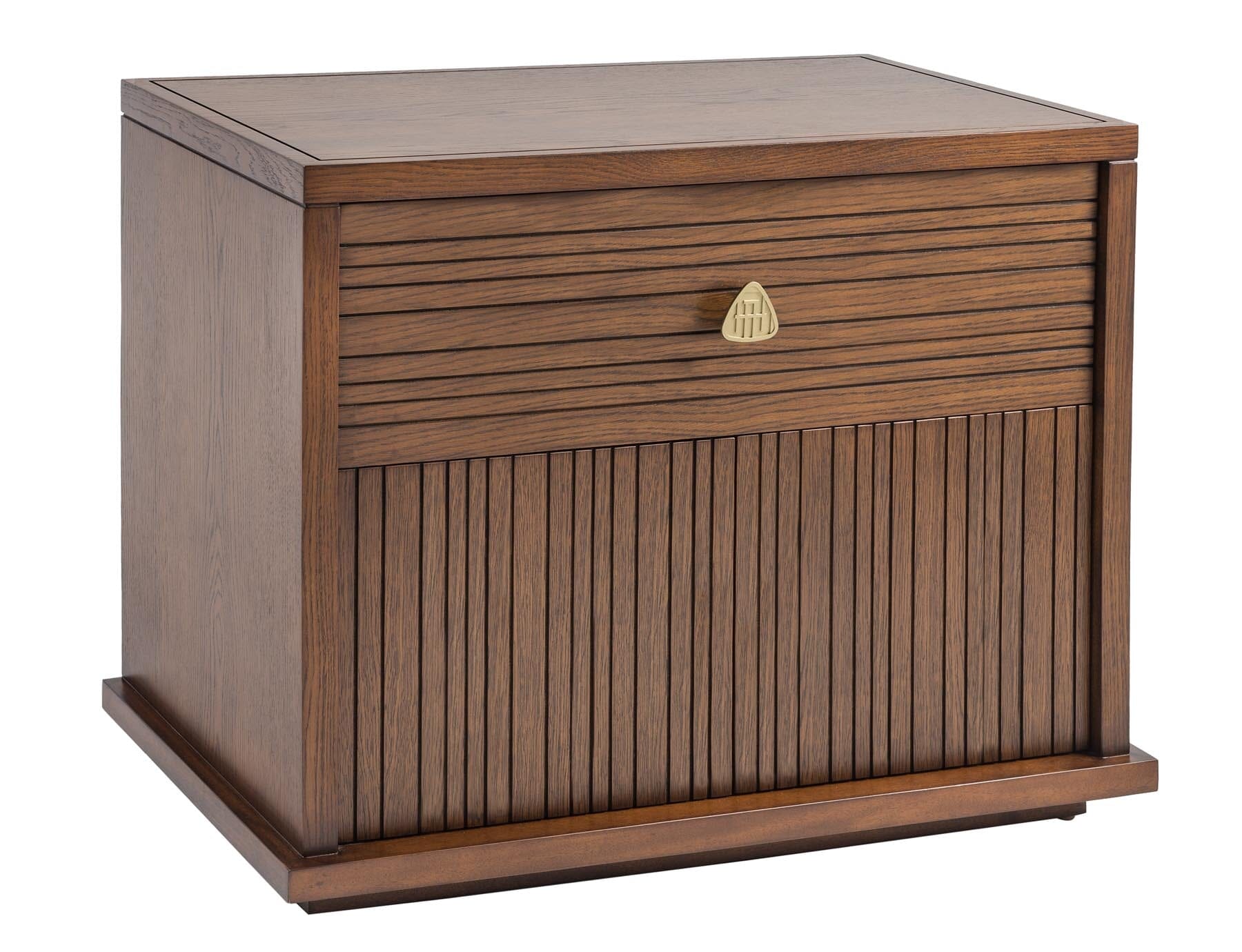 Ein Nachttisch von beeindruckenden Proportionen. Er verfügt über Fräsungen an der Vorderseite seiner Schublade und der Türen. Dieses einzigartige Stück zeichnet sich durch ein zeitgemäßes und eklektisches Design aus, das perfekt zu anderen Betten und Möbelstücken passt.
