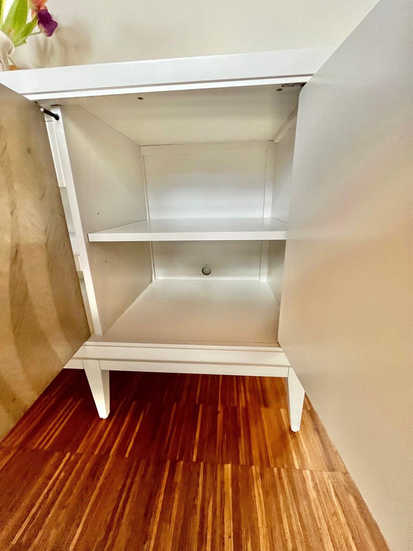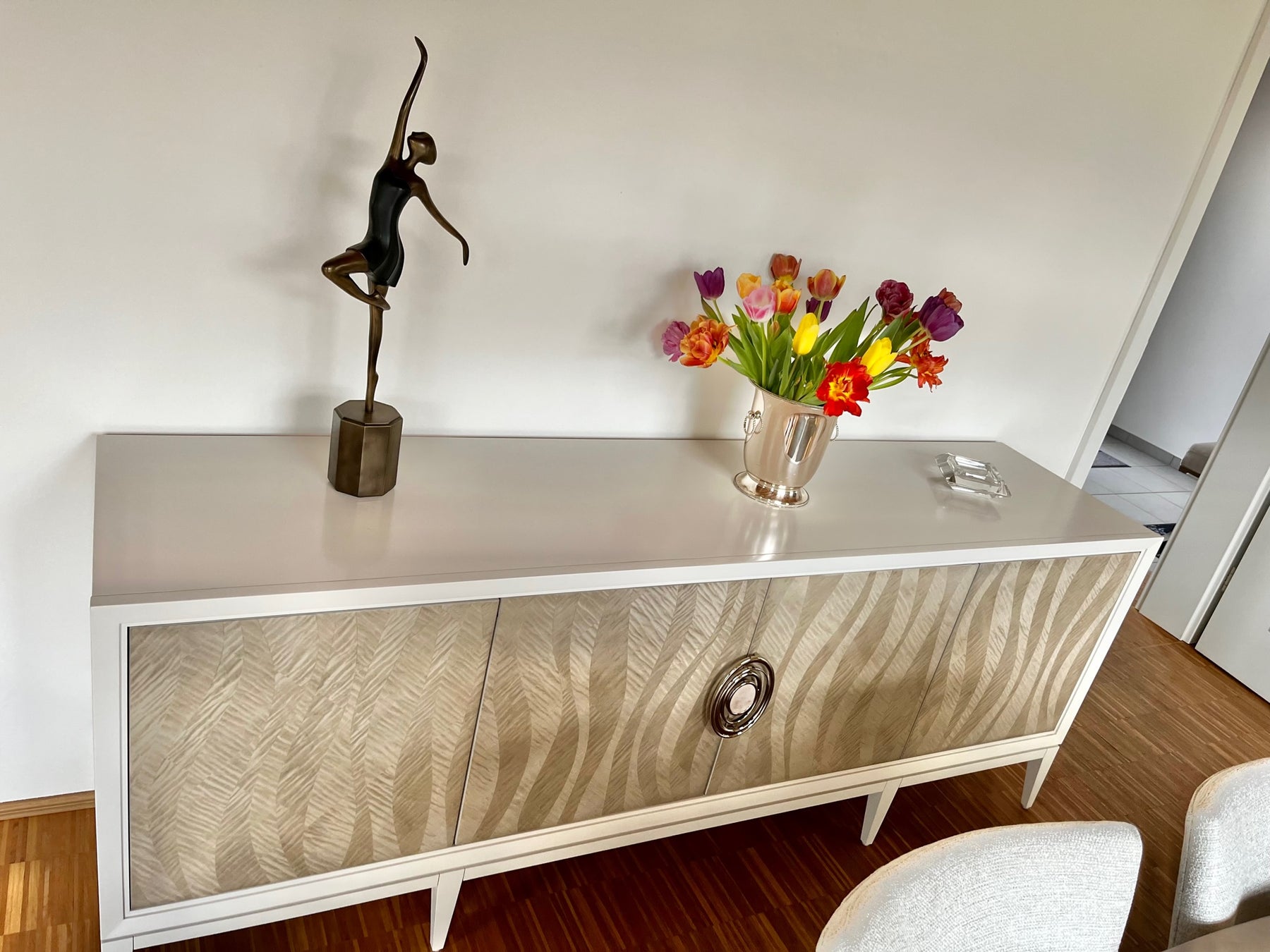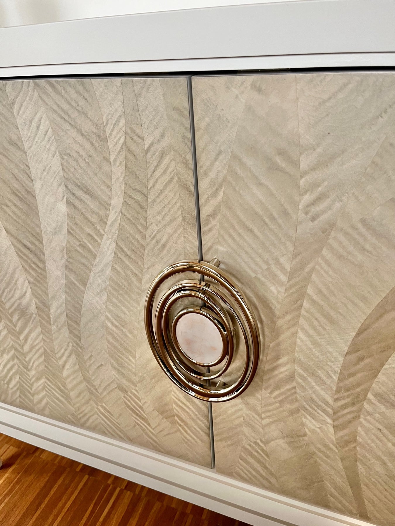 Mit einem rhythmischen Muster, das an fließendes Wasser erinnert, kombiniert diese Konsole organische Elemente mit luxuriösen Details. Sie verfügt über berührungsgesteuerte Türen, kunstvoll gefertigt aus grauen Ahornfurnieren in einem warmen Chinchilla-Finish, betont durch goldfarbene Beschläge. Das Design wird durch das Almond Milk-Gestell und den bemalten Innenraum mit großzügigem Stauraum, verstellbaren Regalen und Kabelführungen ergänzt. Gehäuse in Almond Milk. Vier Türen mit Fronten in Chinchilla mit Touch-Verriegelung an den Außentüren. Hinter jeder Außentür befindet sich ein verstellbares Regal. Hinter den Mitteltüren befinden sich ein verstellbares Regal und zwei Türen mit Seitenführungen. Innenraum in Almond Milk. Löcher für die Kabelführung. Beschläge an den Mitteltüren in Whisper of Gold mit Harzeinlage.