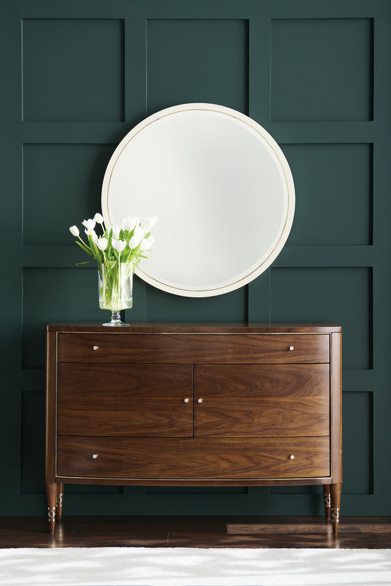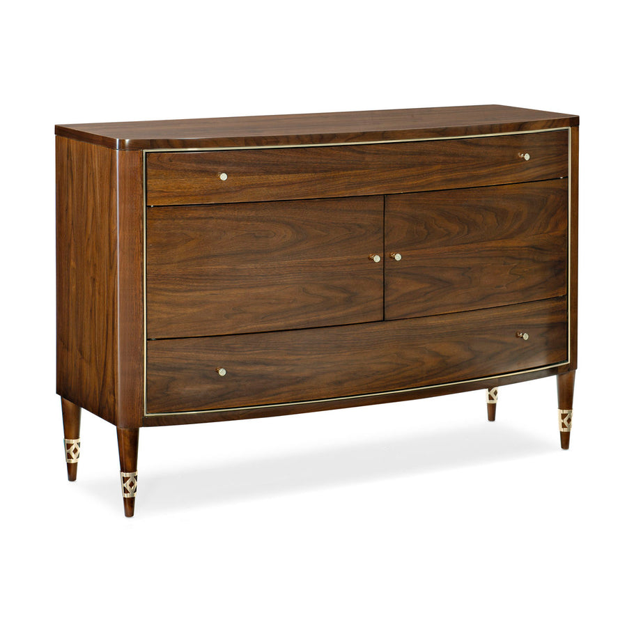 Diese Kommode ist eine vielseitige Ergänzung für jeden Raum und kombiniert moderne Designelemente mit traditionellen, edlen Materialien. Der Rich Walnut-Finish betont die natürliche Holzmaserung, ergänzt durch metallische Akzente in Whisper of Gold. Die Schubladen sind mit Trennelementen und Schmuckorganisatoren ausgestattet. Hinter den Türen befindet sich ein offenes Aufbewahrungsfach sowie ein herausziehbares Fach. Dieser Schrank besticht durch seine zeitlose Eleganz und Multifunktionalität. Außen- und Innenräume des Gehäuses in Rich Walnut. Eingesetzter Frontrahmen aus Metall und durchbrochene Zwingen in plattiertem Whisper of Gold. Zwei Schubladen mit Seitenführungen. Obere Schublade mit Einsatz zur Schmuckorganisation. Untere Schublade mit herausnehmbaren Trennwänden. Zwei Türen mit offenen Fächern, ein herausnehmbares Regal und eine ausziehbare Ablage zur Unterbringung eines Druckers oder anderer Gegenstände. Schubladeninnenraum in Walnut Stain.