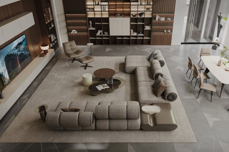 Schaffe einen besonderen Platz in deinem Zuhause mit dem raffinierten Charakter und Komfort dieses atemberaubenden Ecksofas. Einzigartig im Design, nisten sich die Sitzkissen unter einem breiten Regalarm ein und schaffen so einen stilvollen Akzent. Perfekt zum Entspannen, ist dieses Sofa in einem neutralen, leinenähnlichen Stoff mit einem modernen Fischgrätenmuster gepolstert. Ein eckiger Holzsockel in Pyrit trägt den Rahmen und verleiht dem Design zusätzlichen Halt. Gepolstertes Sofa. Lose Sitz- und Rückenkissen. Breiter Regalarm. Eckiger Holzsockel. Holzoberfläche in Pyrit.