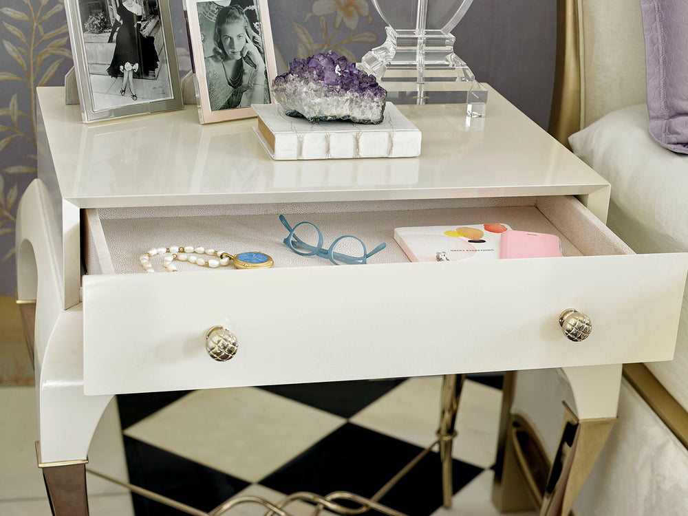 Dieser glamouröse Nachttisch bringt die charakteristischen Banddetails der Kollektion zum Leben. Das elegant an den französischen Stil angelehnte Stück erhält eine zeitgenössische Note. Überzogen mit Crème De La Crème Lack, sind zwei Drittel der anmutig geschwungenen Cabriole-Beine in brillantem Majestic Gold getaucht, komplettiert durch ein stilisiertes, goldenes Band als Querstrebe. Ziehen Sie an den runden, gesteppten goldenen Knöpfen, um die Schublade zu öffnen, die innen mit einem edlen Crème Shagreen-Muster gepolstert ist. Der Pariser Nachttisch ist eine Couture-Aussage für jedes Signature-Bett und repräsentiert exklusive Einrichtung und hochwertige Möbeldesigns. Eine Schublade mit vollständig gepolstertem cremefarbenem Shagreen-Einsatz und Soft-Close-Führungen. Metalltrage an der Unterseite in Majestic Gold.