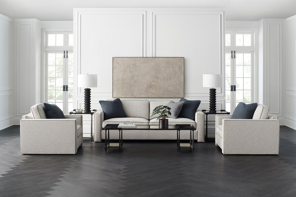 Die Welt der Luxusmöbel wird durch den Welt Played Stuhl neu definiert. Inspiriert von der Fashion Week in Paris, präsentiert dieser Stuhl modernes Styling mit einer warmen und texturierten Ausstrahlung. Die Herbstfarben und Materialkombinationen, die von führenden Modehäusern präsentiert wurden, inspirierten die Kombination aus Tweed, Schokolade und Gewürzen. Hergestellt aus einem grauen, von Herrenbekleidung beeinflussten Stoff, zeichnet er sich durch klare Linien und lineare Formen aus, die mit kontrastierenden Steppnähten in Schokoladenbraun betont werden. Das Ergebnis ist eine Ästhetik von zurückhaltender Eleganz. Die Kollektion umfasst ein passendes Sofa und ein Schlafsofa in drei verschiedenen Farbvarianten. Mit einer Spur Armlehne, Kontraststeppnähten am Gestell und den Kissen sowie lose Sitz- und Rückenkissen bietet dieser Stuhl zeitlose Schönheit und Handwerkskunst.