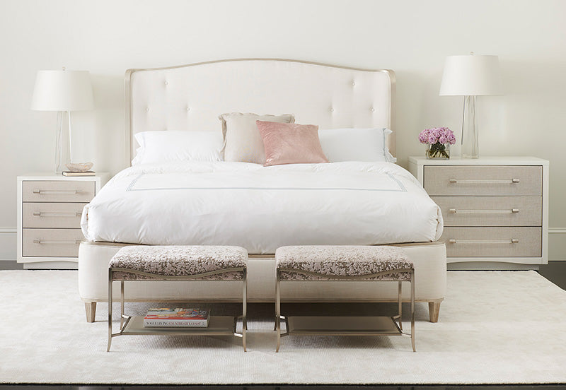 Upholstered Bed with Gently Flowing Lines Gently flowing lines and gentle curves make this upholstered bed a complement to many styles while providing an impressive accent of its own. Button pulls and an exposed wooden frame in silver magic lacquer emphasize the light wing shape of the headboard. Exquisitely tailored in a neutral linen for a luxurious look that is easy to care for. Features adjustable slats that allow for a variety of mattress and box spring thicknesses. Upholstered headboard, footboard and sideboard, wooden decorations and legs in silver magic.
