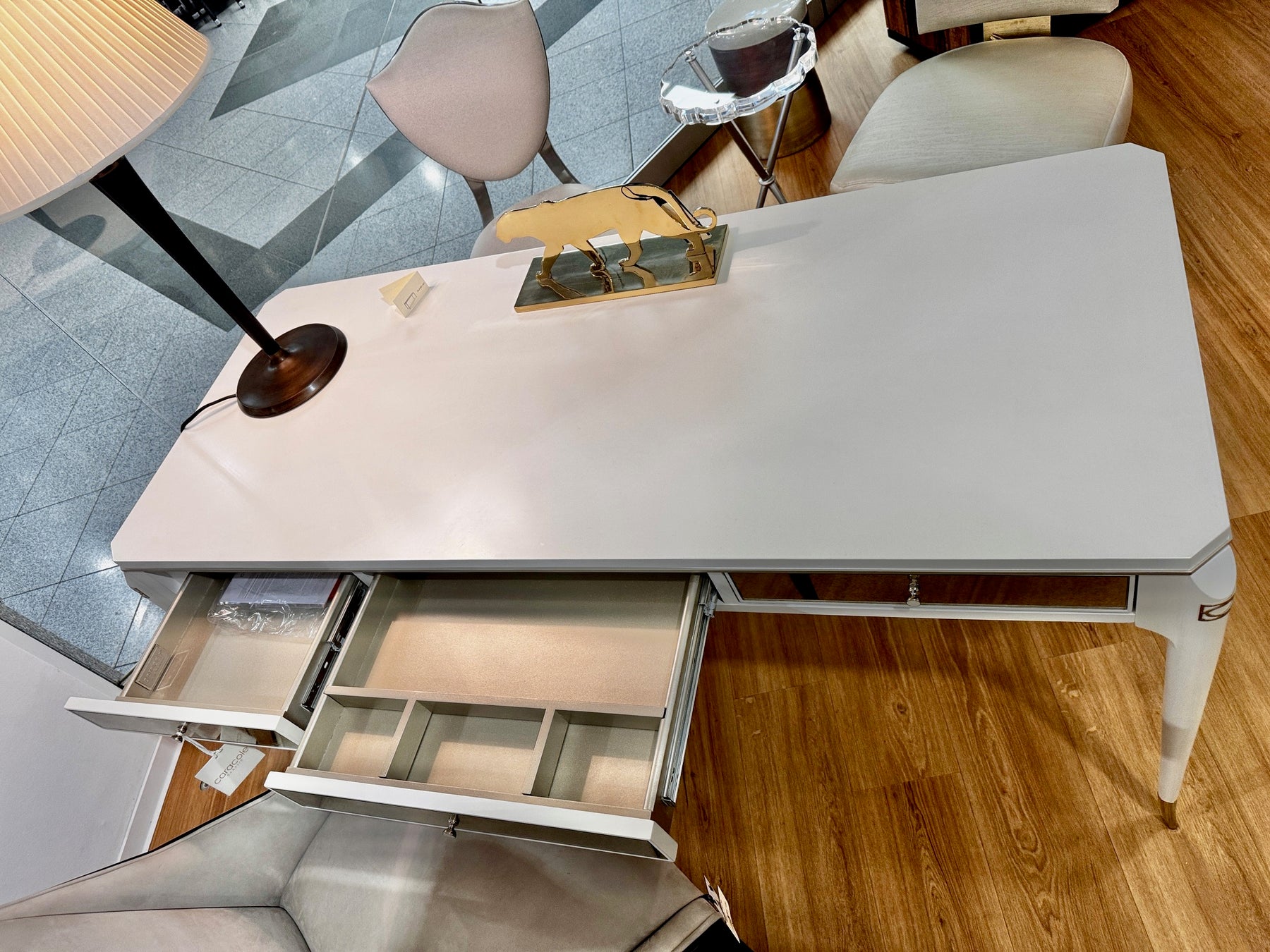 This elegant dressing table from the Premium Furniture range offers a moment of relaxation. Its classic shape is emphasized by a Soft Silver Leaf finish. When open, it shows an integrated mirror and a fold-down front panel as a work surface. The design is completed by acrylic legs with metal ferrules in Whisper of Gold. This piece of furniture fits perfectly into urban apartments. Casing in Soft Silver Leaf. Hinged top with internal mirror. Screen printed detail at top. The front apron folds down to provide a flat work surface. Tapered round acrylic legs with Whisper of Gold plated ferrules. Interior in Blanc.
