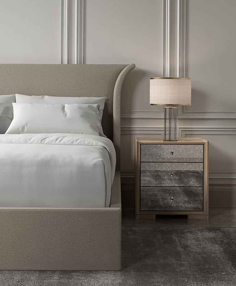 Das vollständig gepolsterte Bett mit verlängerter Rückenlehne aus hochwertiger Birke besticht durch sein elegantes Design und exzellenten Komfort. Es fügt sich harmonisch in jedes Schlafzimmer ein und lässt sich ideal mit der Kommode CLA-021-012 kombinieren. Diese neunschubladige Kommode aus japanischem Sen-Furnier im warmen Taupe-Finish bringt natürliche Eleganz und verleiht dem Raum eine luxuriöse, aber entspannte Note. Der passende Nachttisch CLA-021-063 greift das sanfte Taupe-Finish und die lineare Maserung des Sen-Furniers auf und ergänzt das Ensemble perfekt. Das Zusammenspiel dieser Elemente schafft ein stilvolles Schlafzimmer, in dem der natürliche Charme der Birke eine einladende Atmosphäre entstehen lässt.