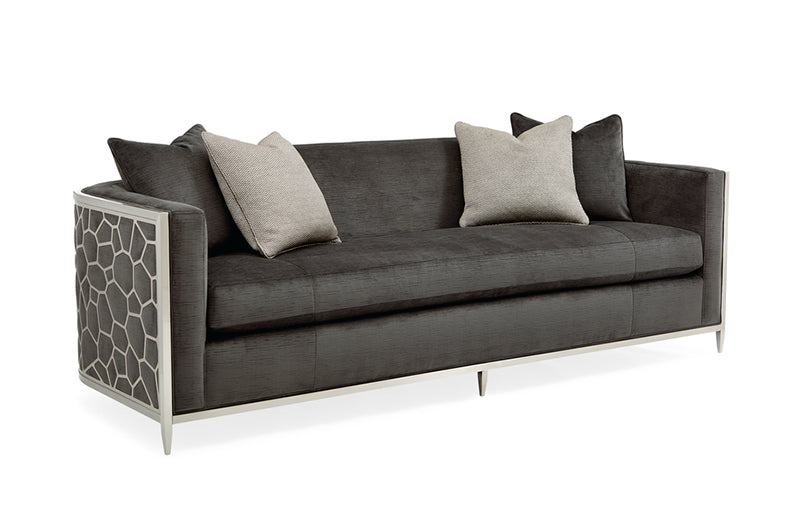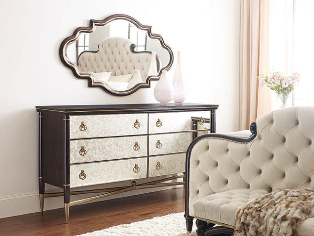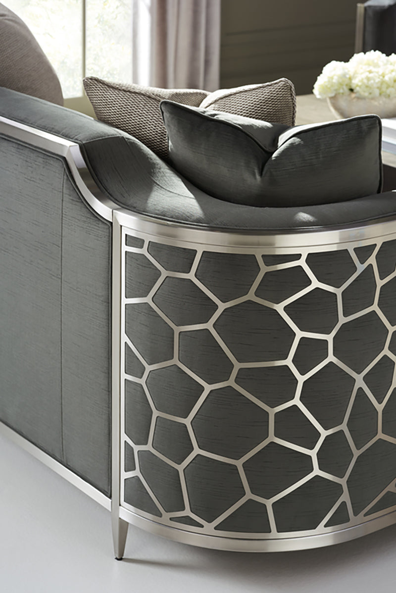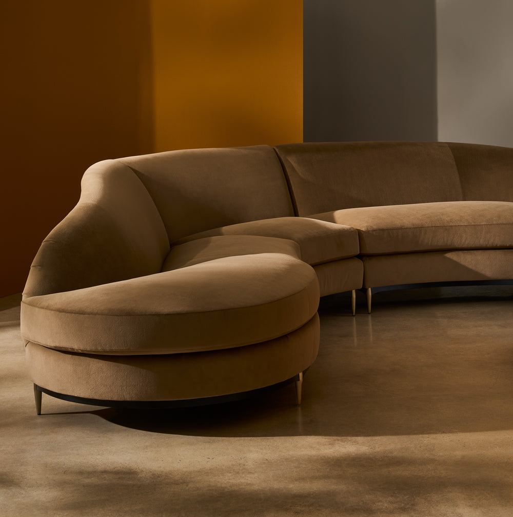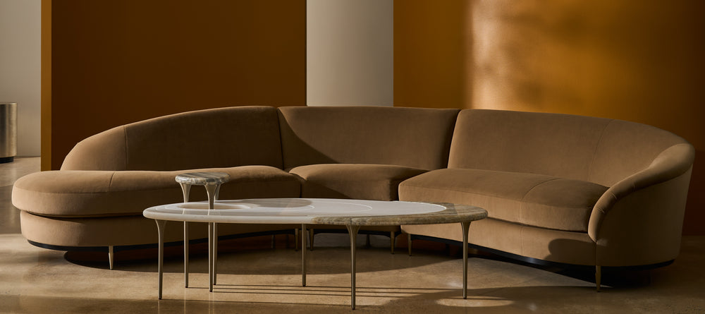 Dieser halbrunde Nachttisch besteht aus Eukalyptusholz, glänzend in Aged Bourbon. Zwei runde Schubladen öffnen sich mit Smoked Bronze-Halbmonden als Griffen. Innen sind die Schubladen in Dark Chocolate lackiert. Ein Smoked Bronze-Rand ziert die Frontkante, während der gesamte Tisch auf einem Metallrahmen ruht. Gehäuse in Aged Bourbon, Metallrahmen und Verzierungen in Smoked Bronze, zwei Schubladen mit Soft-Close-Funktion.