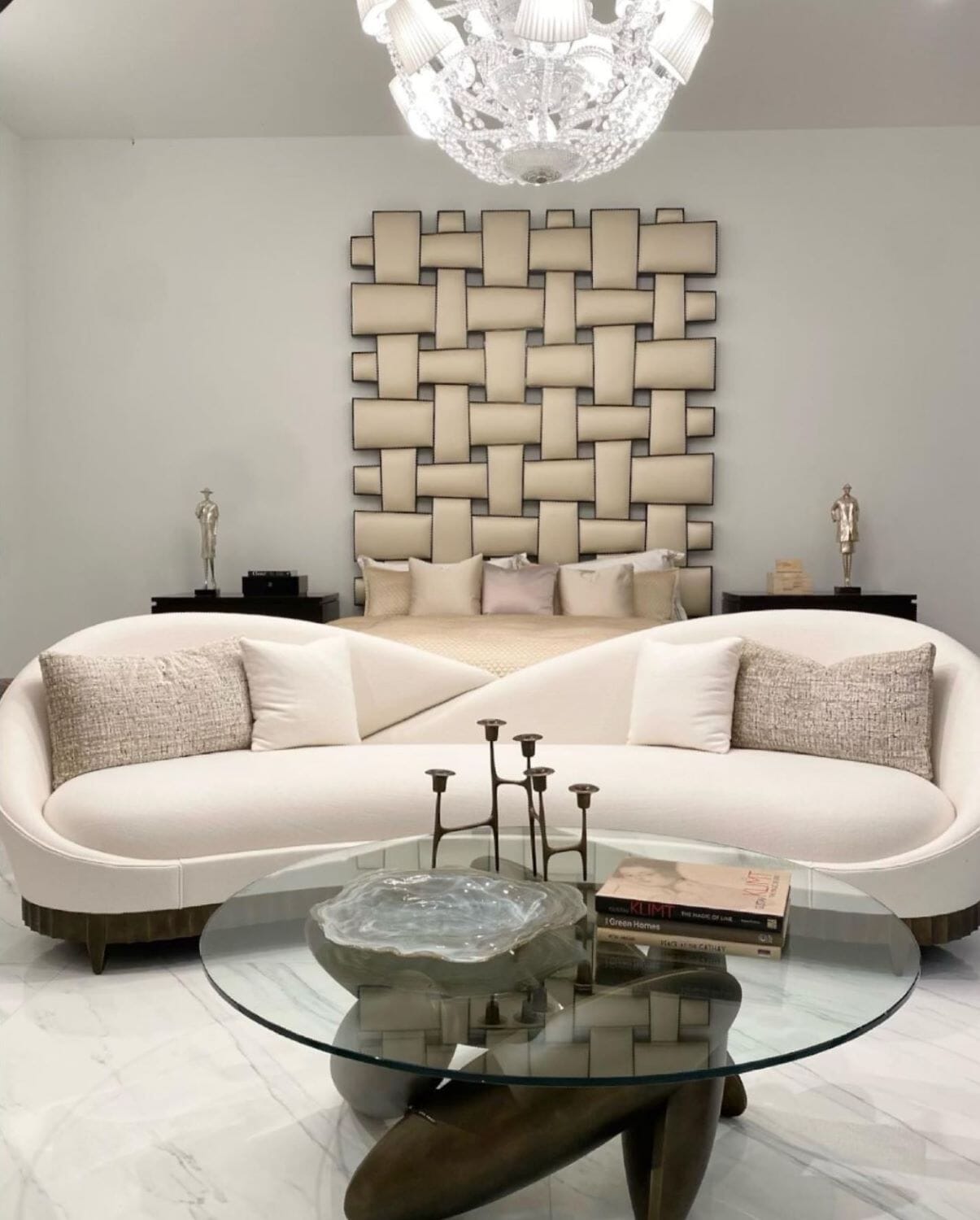 Featuring a dramatic weave pattern that features interlocking upholstered panels in wooden frames, this spectacular headboard is inspired by the mirror Christopher Guy created for the Chanel No.5 promotional video.