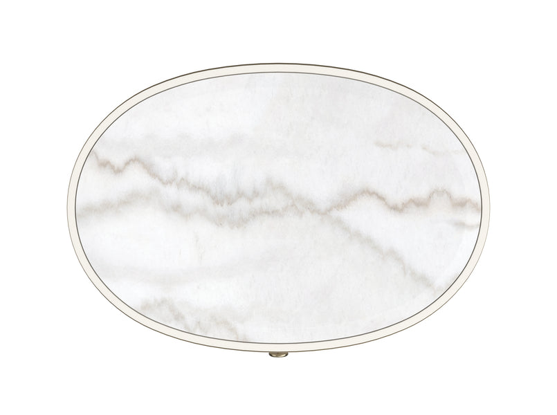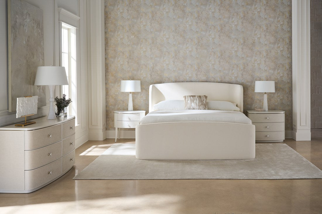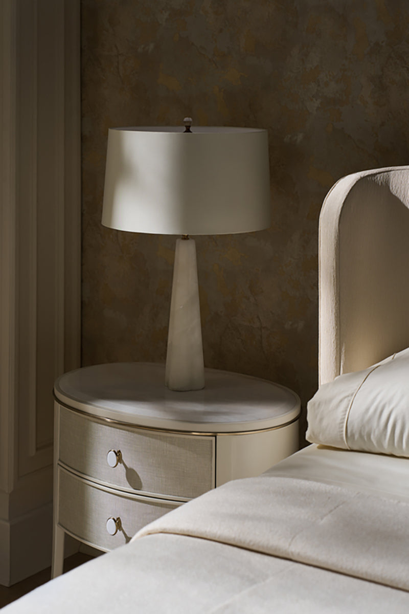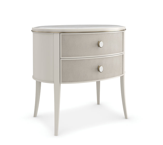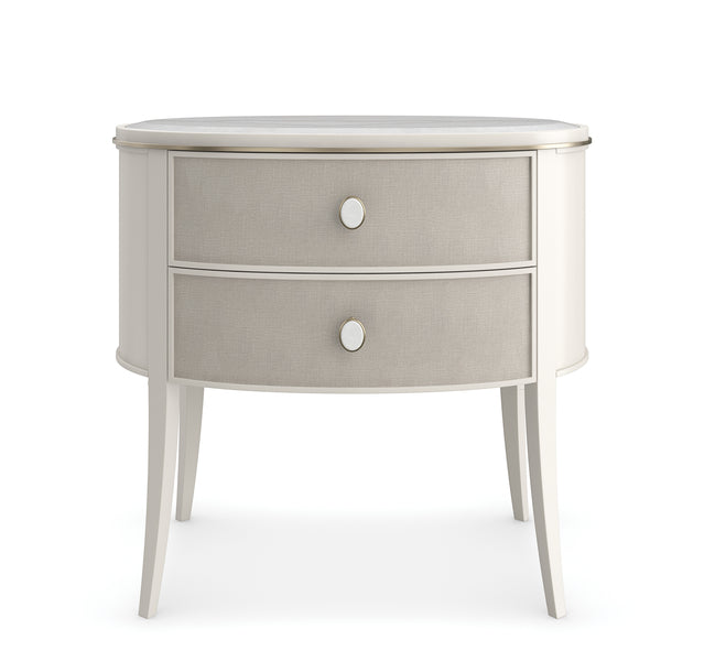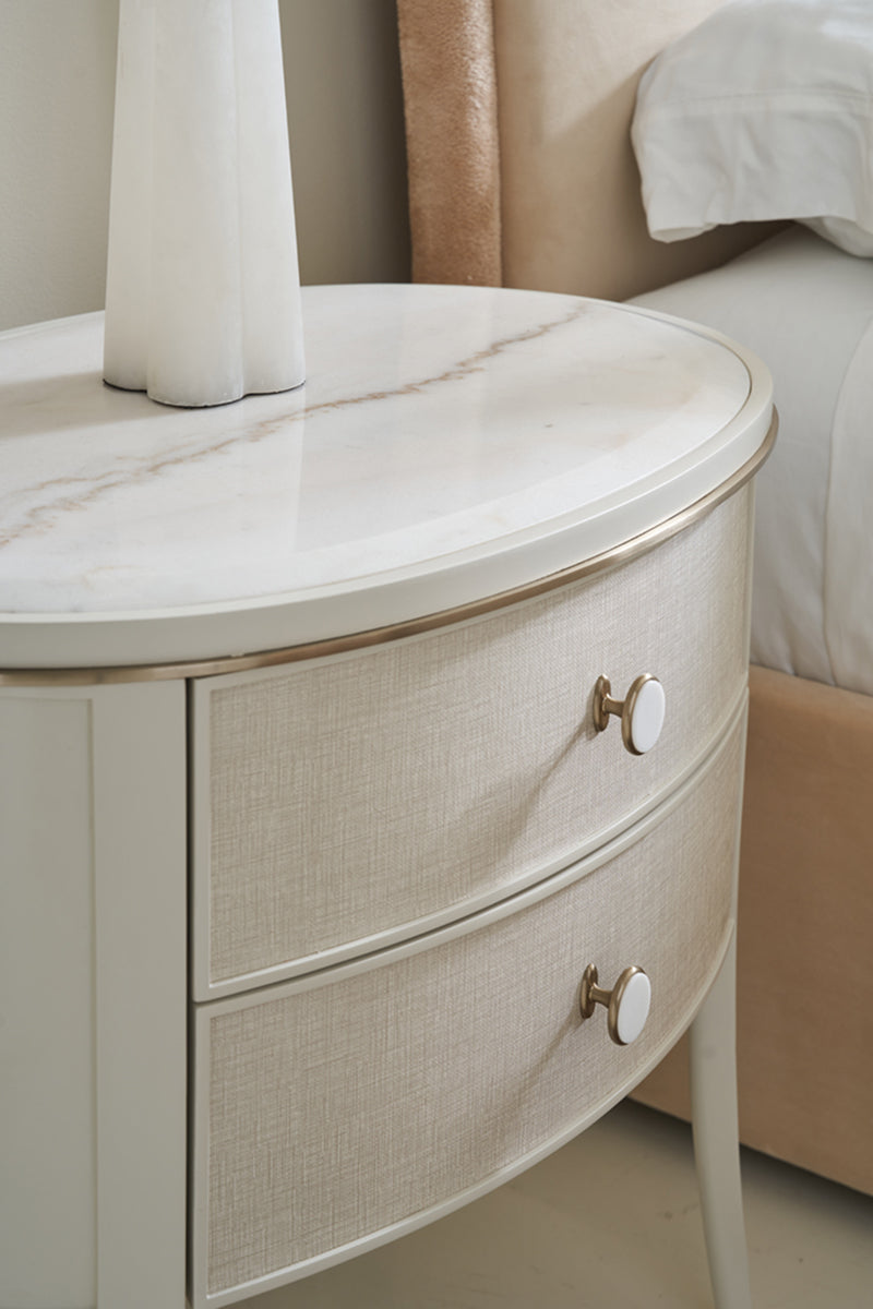 Diese elegante Nachtkommode kombiniert Metall, Holz und Marmor für eine schlichte, stilvolle Optik im Schlafzimmer. Sie hat eine Guangxi-Marmorplatte und zwei sanft abgerundete Schubladenfronten, die in strukturiertes Leinenoptik-Vinyl gewickelt sind.