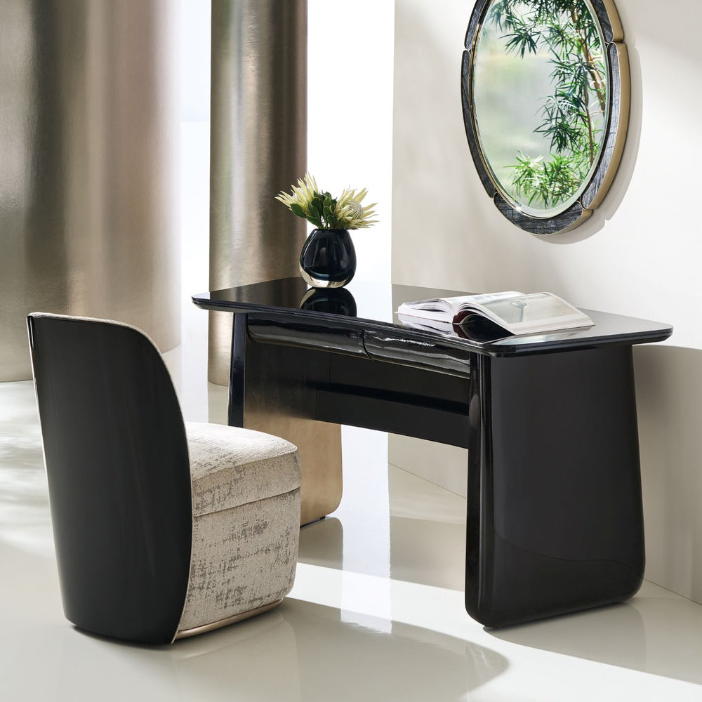 Der Cabochon-Stuhl passt perfekt zu einem Schreibtisch oder als stilvoller Akzentstuhl. Der moderne, abgerundete Stuhl hat eine hohe, geschwungene Rückenlehne und steht nahe am Boden. Die Holzrückseite ist in glänzendem Piano Black gehalten. Die Innenseite und der Sitz sind mit silber-taupefarbener Chenille gepolstert. Die Basis in Charcoal Leaf verbirgt kleine Rollen für einfaches Bewegen. Gepolsterter Stuhl. Holzrückseite in Piano Black. Basis in Charcoal Leaf. Verdeckte Rollen für Beweglichkeit.