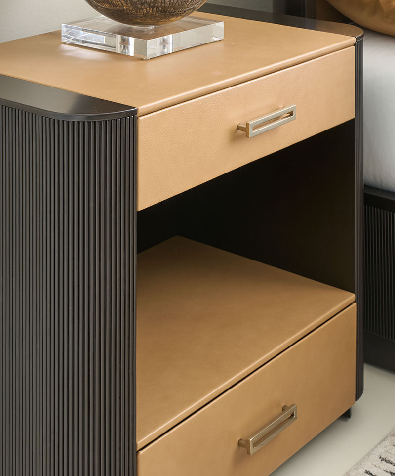 Ergänzen Sie Ihr Bett mit eleganten Nachttischen, die ebenso traumhaft sind. Dieses atemberaubende Stück verfügt über ein modisches Design mit einer sanft abgerundeten Form, betont durch Dark Chocolate, exquisite geriffelte Seiten und Kamel-Leder-Schubladenfronten. Ringförmige Griffe in Whisper of Gold schmücken die obere und untere Schublade.