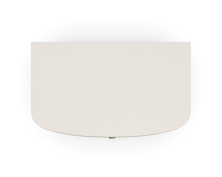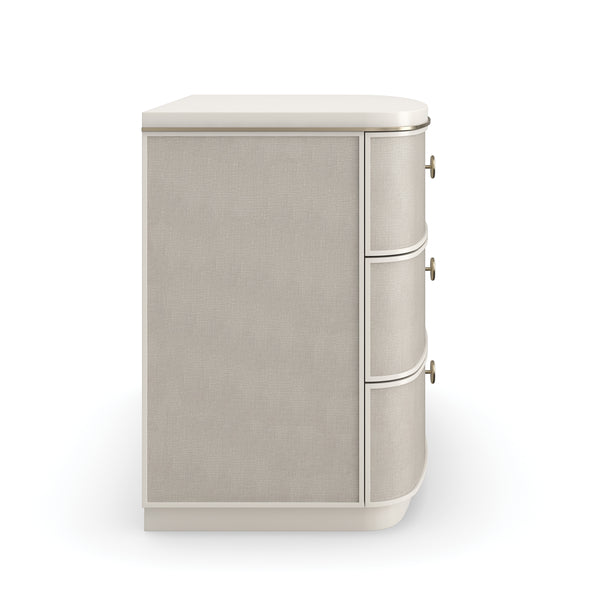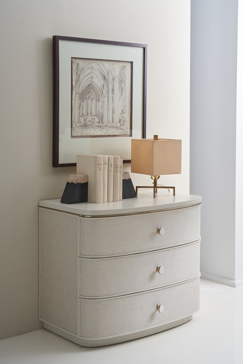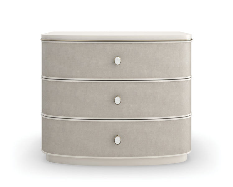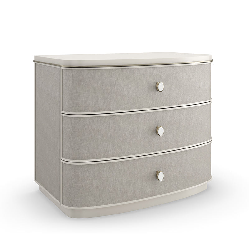 Ein cremiges Almond Milk-Finish kombiniert mit elfenbeinfarbenem Leinen für eine weiche, elegante Silhouette. Die sanft geschwungene Form ruht auf einem klaren Sockel, mit drei geräumigen Schubladen für diskreten Stauraum am Bett.