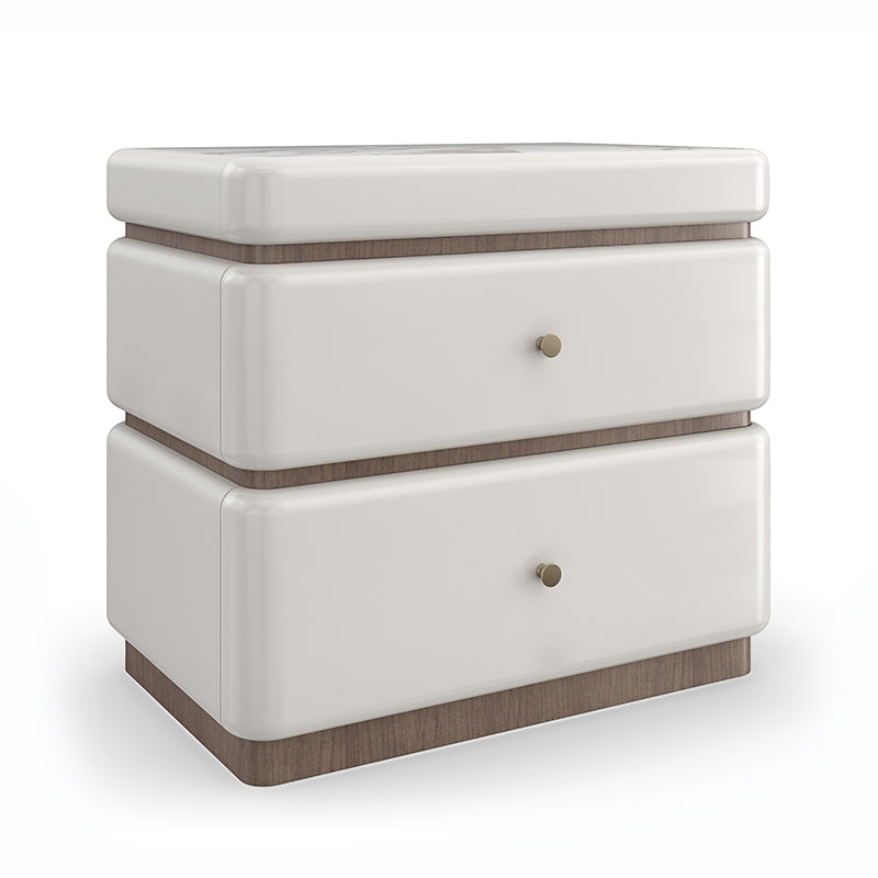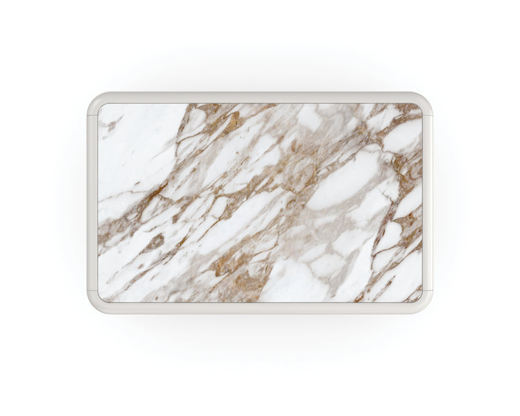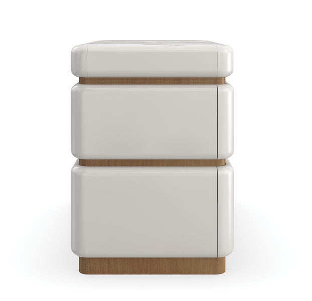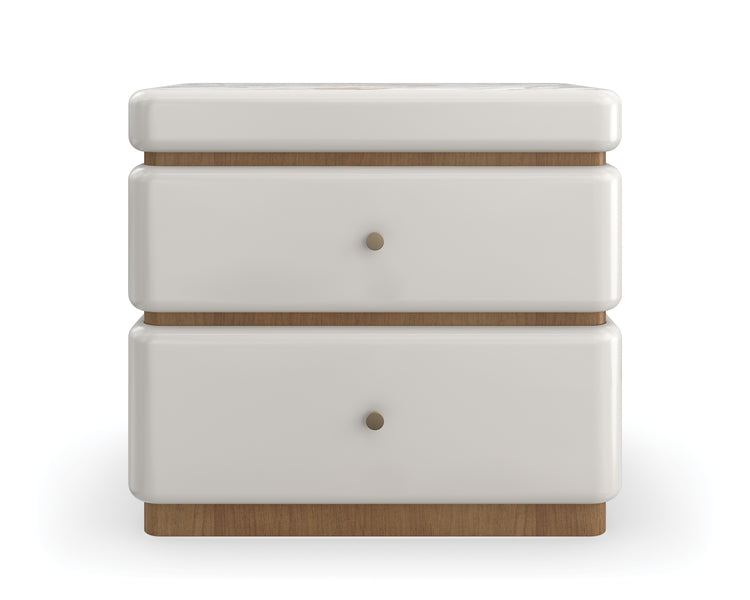Architektonisch mit sanften Kurven und abgerundeten Kanten erinnert dieser moderne Nachttisch an die zeitlose Schönheit von Küstenvillen im Mittelmeer. Einfache, gestapelte Formen sind in Toasted Pecan eingefasst, während die Calcutta Oro-Marmoroberfläche ein luxuriöses, aber strapazierfähiges Designdetail bietet. Er verfügt über zwei sanft schließende Schubladen, in denen Sie Nachttischlektüre und wichtige Dinge ordentlich verstauen können. Passt perfekt zu unserem Malta gepolsterten Bett. Calcutta Oro Marmoroberfläche. Oberseite, Seiten und Schubladenfronten in Almond Milk. Holzverkleidung in Toasted Pecan. Zwei Schubladen mit sanften Schließmechanismen. Innenfarbe in Almond Milk.