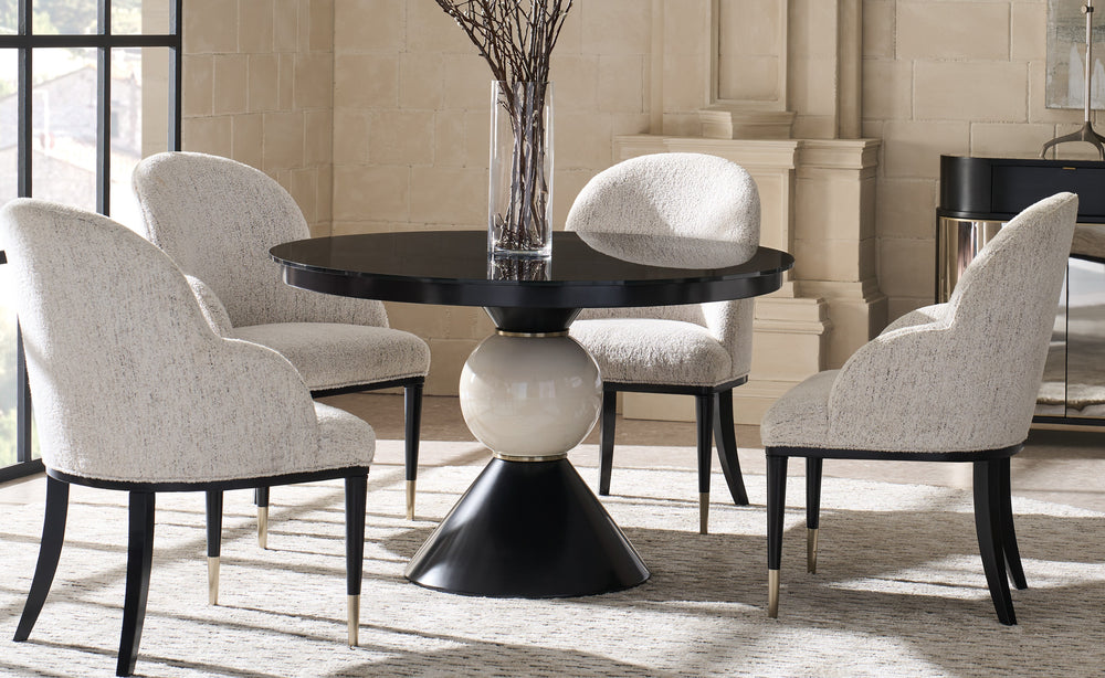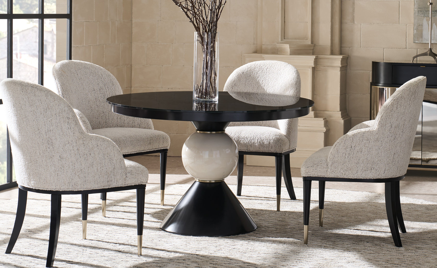 Mit einer anmutigen Silhouette, inspiriert von der gewellten Form einer Wolke, lädt dieser Esszimmerstuhl zum Komfort ein. Fein geschneidert in einem weich texturierten Chenille-Melange-Stoff, bietet sein fast schwarzer Rahmen einen klassischen Kontrast. Metallferrulen in Gebürstetem Gold setzen einen raffinierten Akzent.