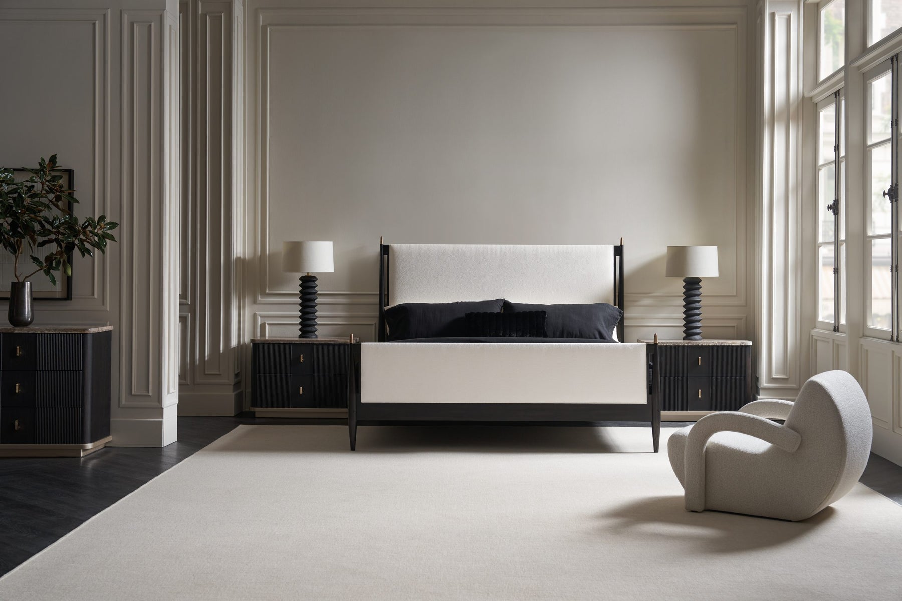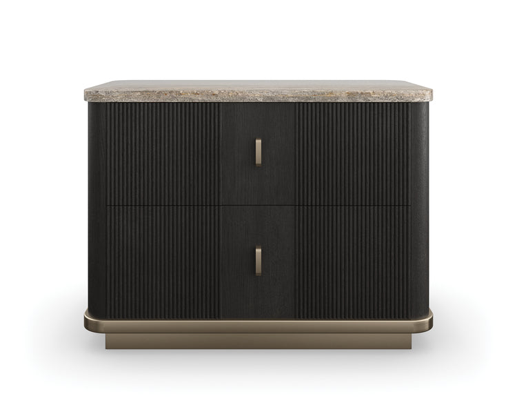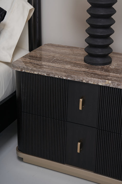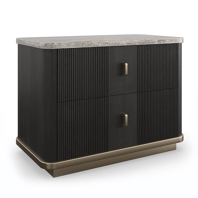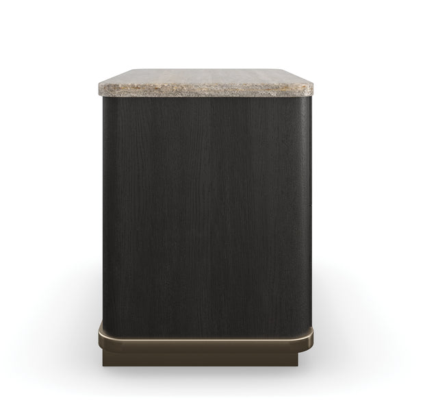 Die natürliche Schönheit des Travertinsteins wird durch die visuelle Rhythmik der geflammten Schubladenfronten in Schwarz gebeizter Eiche betont. Abgerundete Ecken und bronzefarbene Schubladenzüge mit sanften Konturen weichen die klare Form auf und verleihen Wärme. Lackierte Schubladeninnenräume und Zugang an der Rückseite für Kabelmanagement. Oberseite aus dunklem Travertin. Gehäuse in schwarz gebeizter Eiche. Zwei Schubladen mit Soft-Close-Unterführungen. Basis in Neutral Metallic. Innen in schwarz gebeizter Eiche. Oberseite aus Naturstein. Farb- und Strukturvariationen sind möglich.