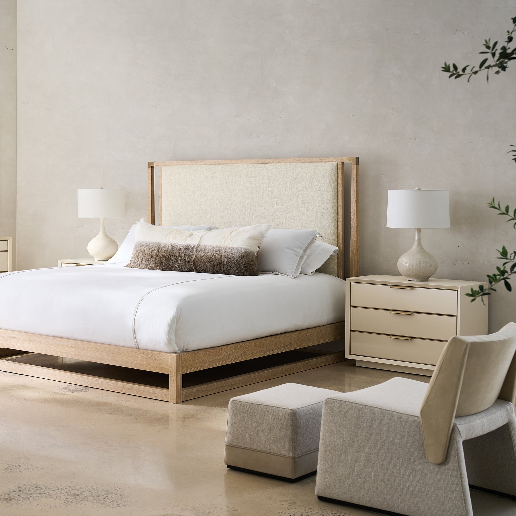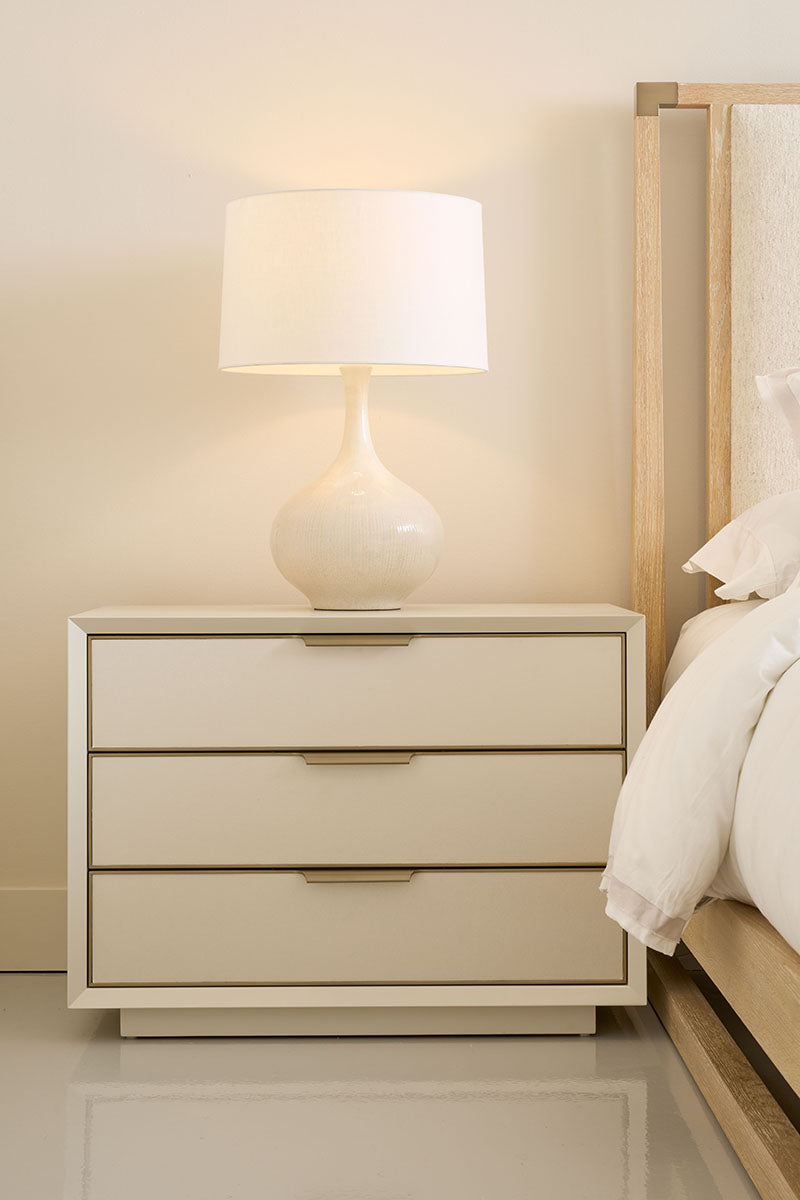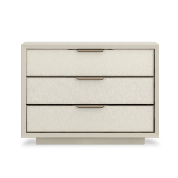 Triple Wrap bietet einen etwas größeren Nachttisch als Double Wrap. Dieser euro-moderne Stil vereint eine helle, raffinierte Mischung aus Materialien und Oberflächen. Drei tiefe Schubladen mit Vinylfronten in perlmuttfarbener Optik, eingerahmt von Champagnergold, ruhen auf einem Sockel.
