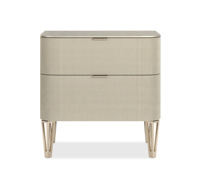 Dies ist eine kleinere Version unseres True Love Nachttisches. Eine vollständige Beschichtung aus glänzendem Oracle-Gold hebt die exquisite Riffelung an den Schubladenfronten mit Whisper of Gold Metallbanddetails und Designerbeinen hervor. Dieses Stück hat zwei Unterbau-Schubladen.