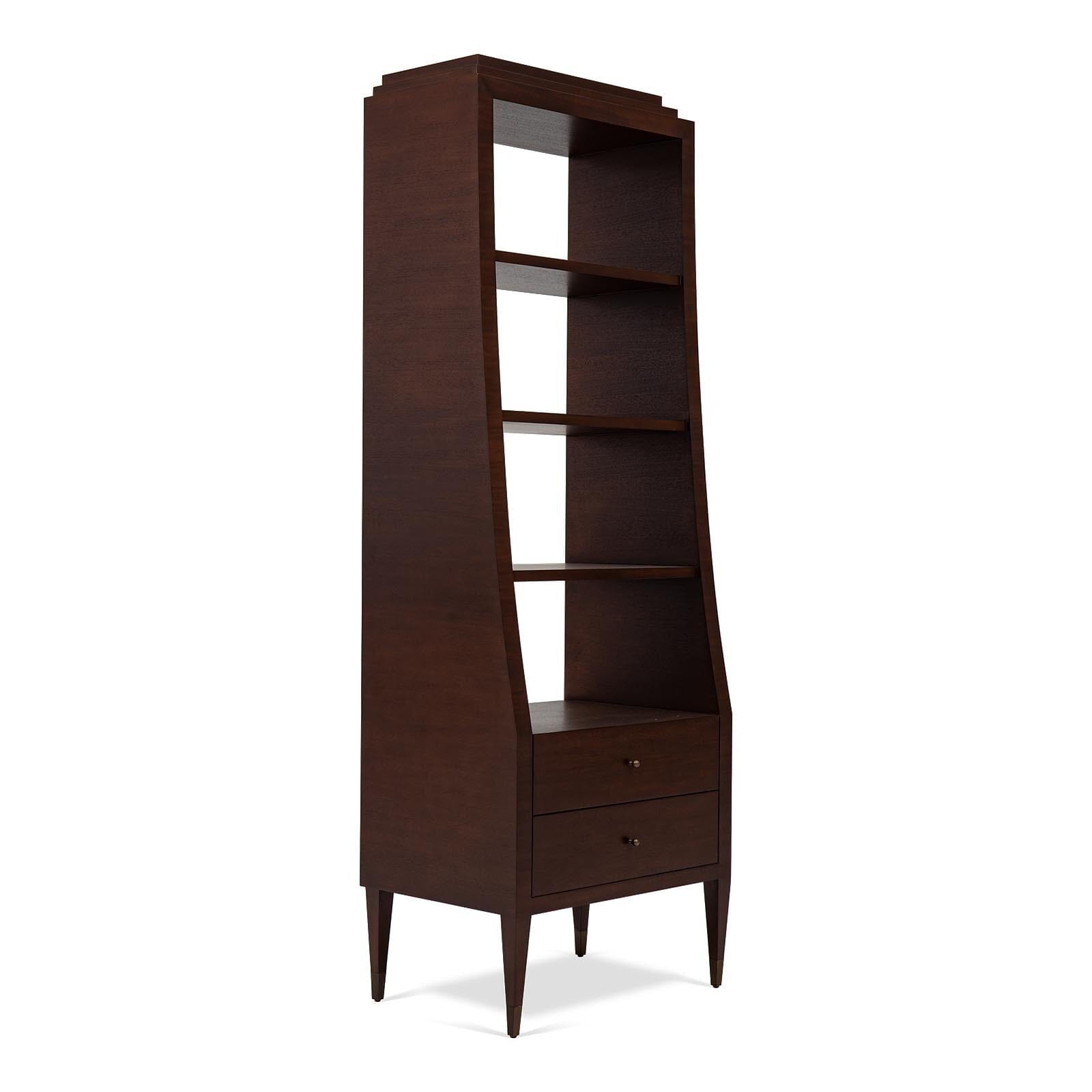 Ein imposantes Bücherregal, wunderschön aus massivem Holz handgeschnitzt und mit 4 Regalen, 2 praktischen Schubladen und Metallkappenfüßen ausgestattet. Die gestufte Oberseite des Designs verleiht diesem fabelhaften Stück Höhe und Eleganz. Auch in einer breiteren Version (87-0020) erhältlich. Exclusive Handwerkskunst, die beeindruckt.