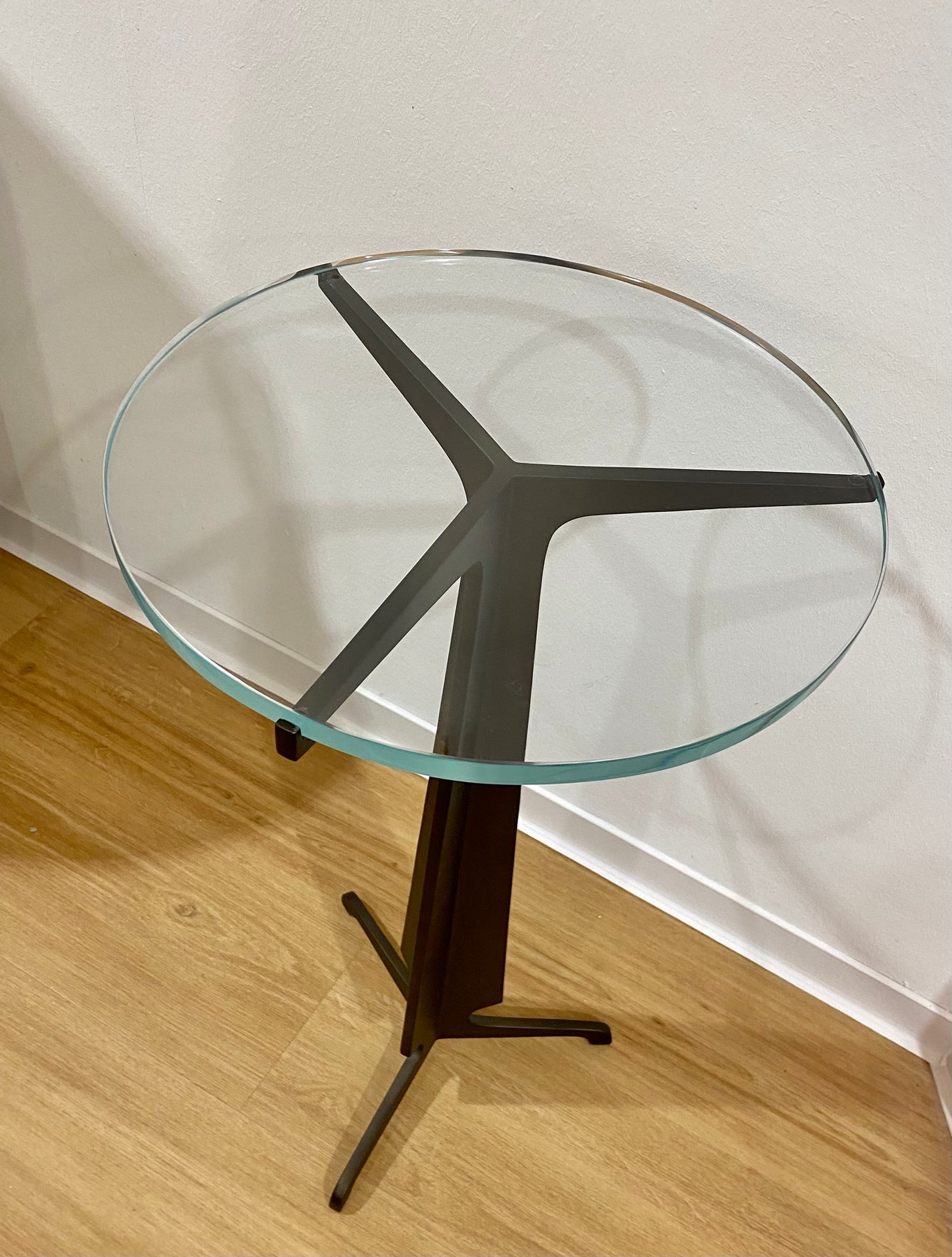 Entdecken Sie unseren stilvollen, modern gestalteten Bistrotisch mit einem auffälligen pyramidenförmigen Metallsockel und Glasplatte.